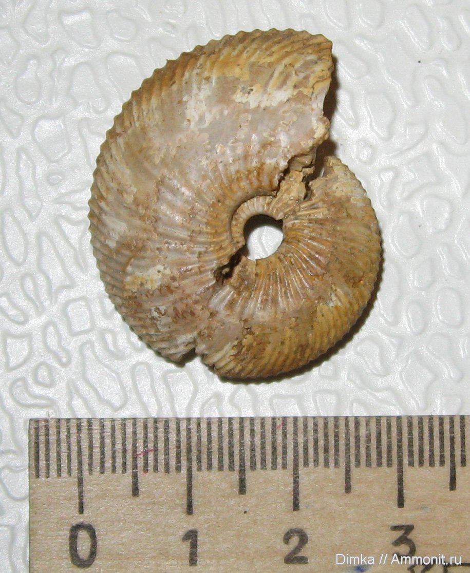 Аммонит найден в нижнекелловейском плитчатом песчаннике в карьере завода "Спартак". Раковина внутри заполнена кальцитом.