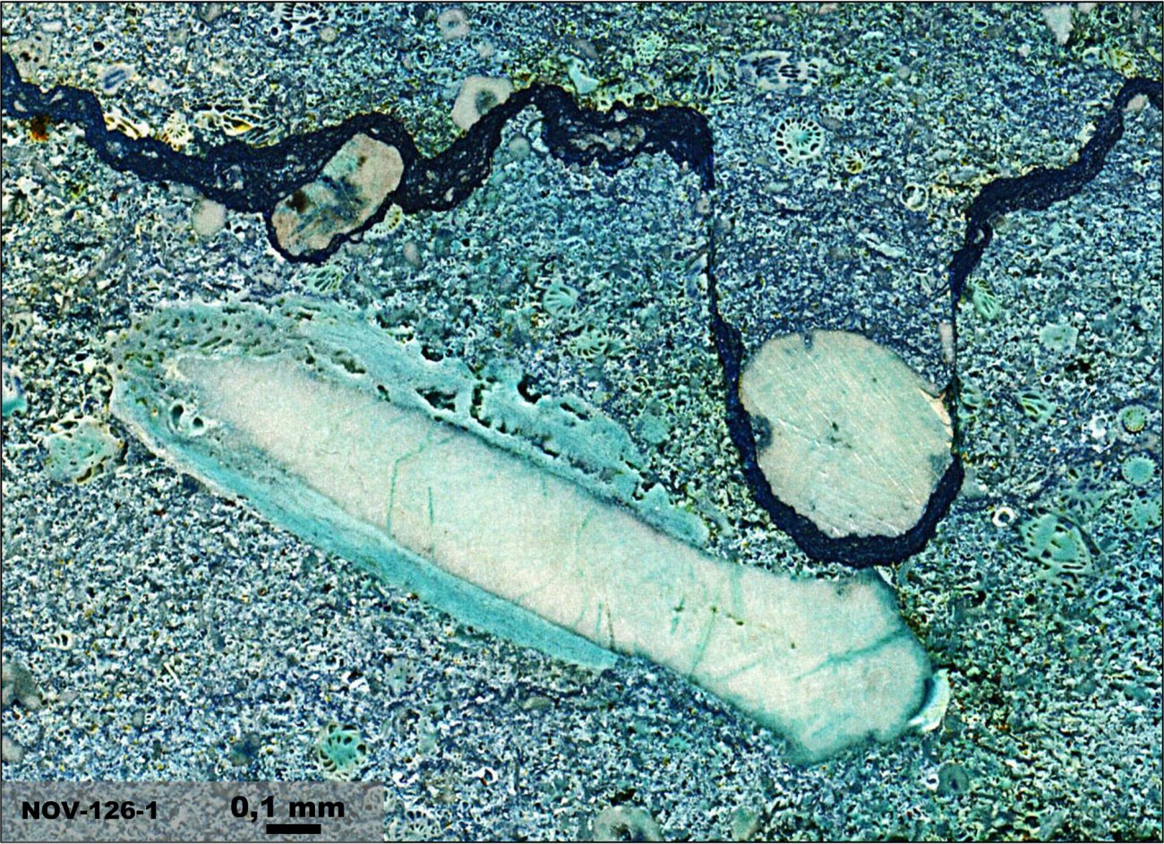 Органогенно-детритовые известняки. Пришлифовка, тонировано красителем. Основание новлинской толщи мячковского горизонта московского яруса среднего карбона.