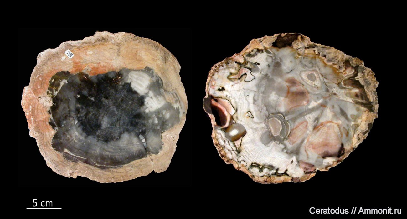 Два образца Araucarioxylon из формации Cerro Cuadrado, Санта Круз, Патагония. Оттуда же происходят знаменитые окаменевшие шишки. На образце слева хорошо заметны ходы древоточцев. Размер образцов: слева 23 x 21.5 см, толщина 15 мм; справа 25 x 21.5 см, толщина 15 мм.