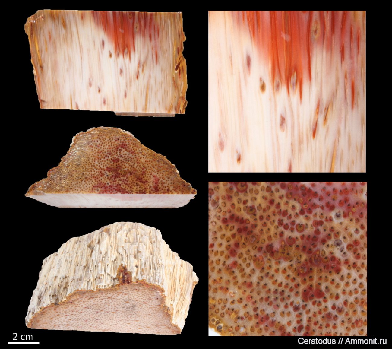Половина небольшоно фрагмента ствола пальмы из штата Техас. Вообще говоря, образцы с такой красноватой окраской более типичны для Луизианы , чем для Техаса, где преобладают серые тона. Но,с другой стороны, местонахождение пальм находится на границе этих двух штатов и деление по территориальному признаку чисто условно. Образец не полирован и был смочен водой для фотографирования. Тем не менее очень отчетливо видно тонкое анатомическое строение ствола. Размеры образца: 10.5х5 см, высота 7 см; Возраст Олигоцен.