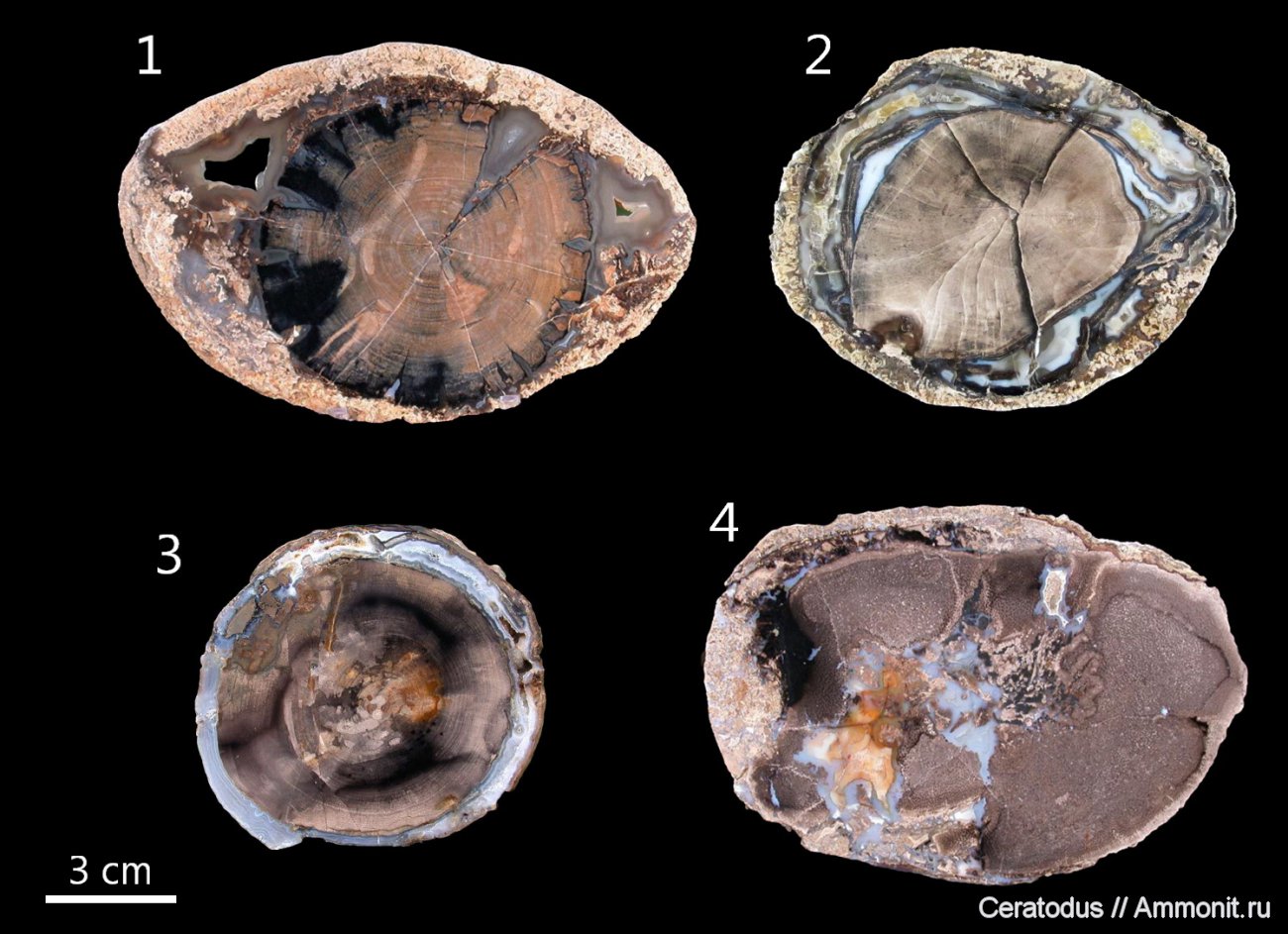 Срезы pepperwood tree (1-3) и palmoxylon (4) из Eden Valley, штат Вайоминг. Превый образец происходит из местности Crazy Horse и не содержит агатовых включений голубого цвета. Остальные три образца типичные представители Blue Forest wood и содержат участки агатизации голубого или желто-коричневого цвета. На образцах 1 и 3 хорошо заметны следы деятельности насекомых древоточцев.