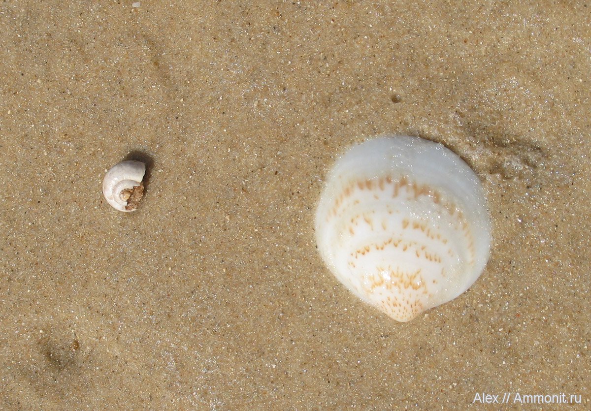 Гастропода из слоев песчаника (Гастроподы в породе) и современная двустворка вместе лежат в зоне прибоя на пляже в Нетании. Там это вполне обычная картина - из размывающегося песчаника вымываются раковины и снова захораниваются в слоях песка, вместе с современными двустворками. Так же происходило переотложение окаменелостей и в прошедшие геологические эпохи.