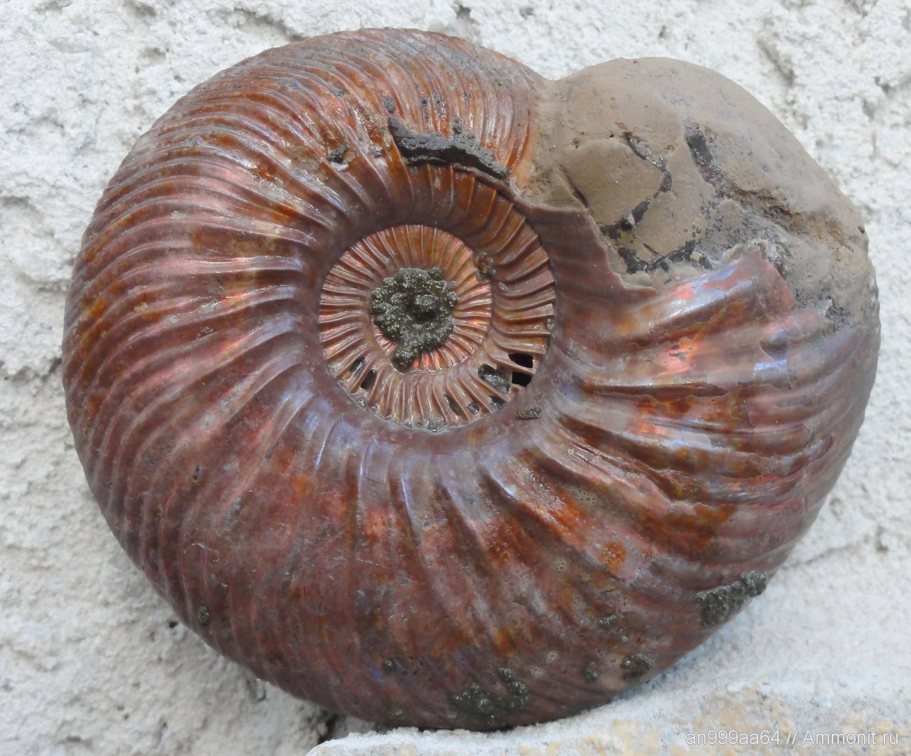 "довольно крупный" микроконх аммонита Quenstedtoceras lamberti, мах размером 6,4 см, нехватает 1/4 части оборота, аммонит начинает ржаветь, это происходит в тех случаях, когда вода неоднократно попадает внутрь фрагмокона и потом испаряется