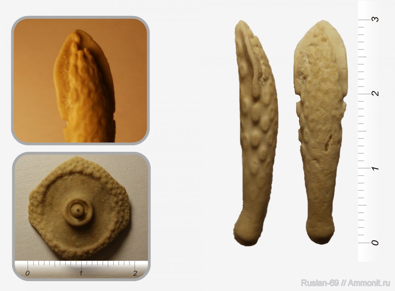 Это Archaeocidaris clavata (von Eichwald, 1860), более характерный для нижележащего каширского горизонта. Также, иглы подобного морфотипа, с лопастями, были выделены А.П.Ивановым как Archaeocidaris incurvis (синоним A. clavata). | ||||||