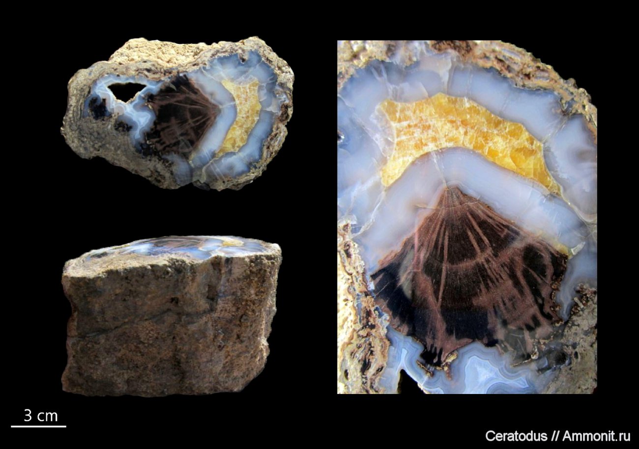 Я сейчас рассмотрел образец внимательно и, пожалуй, соглашусь с Вами. Желтая область поддалась полировке значительно хуже, чем халцедон, а под микроскопом хорошо заметна характерная для кальцита спайность. В описании сделал соответствующие изменения. | ||||||