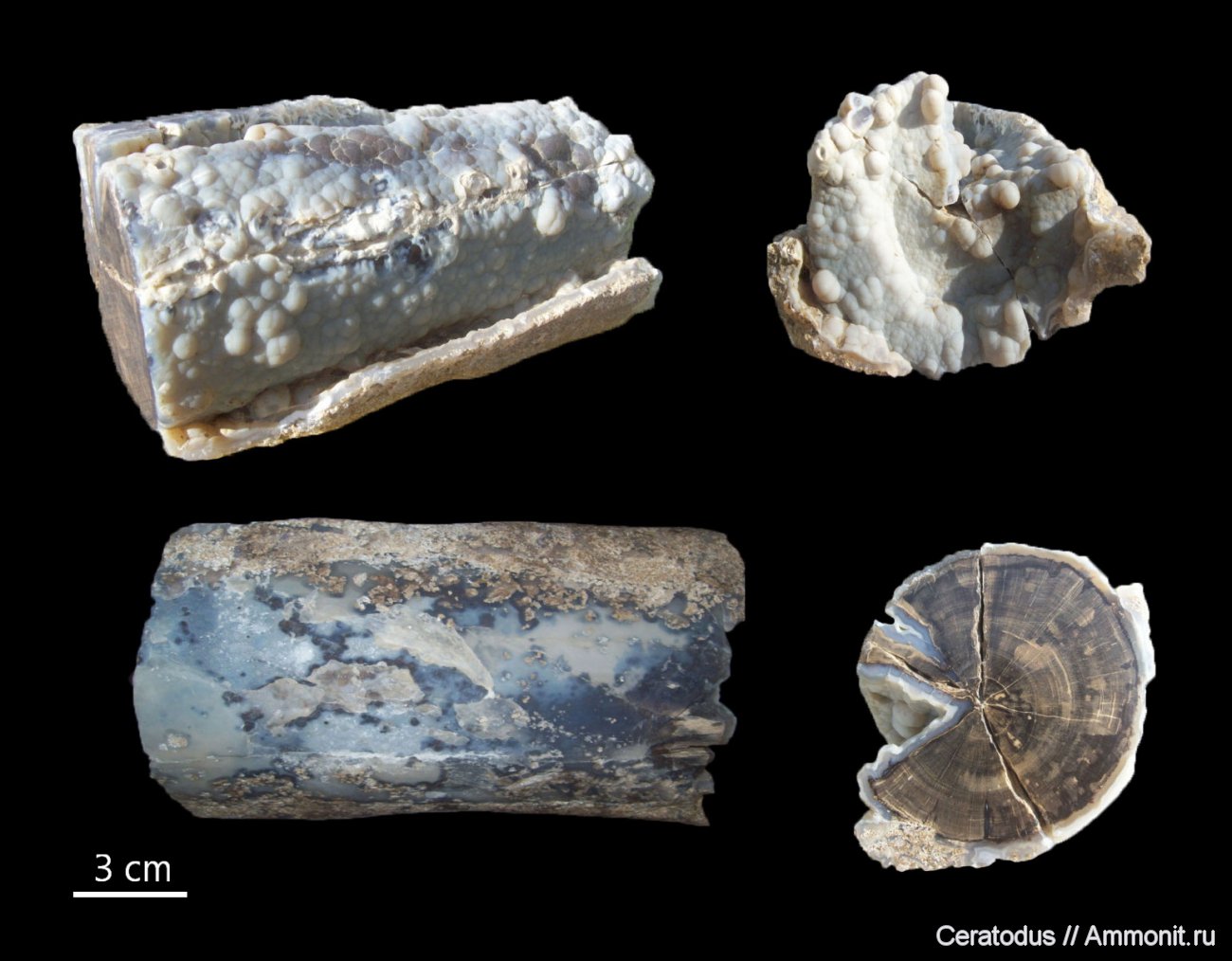 Образцы, подобные этому, в англоязычной литературе называют Candlewood (свечное дерево) из-за покрывающего их поверхность слоя натечного халцедона, напоминающего стекающий по свече расплавленный воск. Нередко подобные образования, обычно голубого или белого цвета, выстилают внутренние пустоты , образовавшиеся в результате разрушения древесины. Местонахождение Eden Valley, Вайоминг.