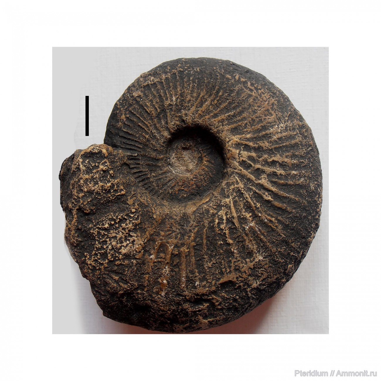 Образец из старых сборов (еще советского периода). Привожу в порядок крымскую коллекцию. Аммонит найден на дороге, ведущей от п. Научный (Обсерватория) к п. Верхоречье (Бахчисарайский район Крыма). Возраст - нижний мел, готерив. Линейка - 1 см. Буду признателен за помощь в определении...