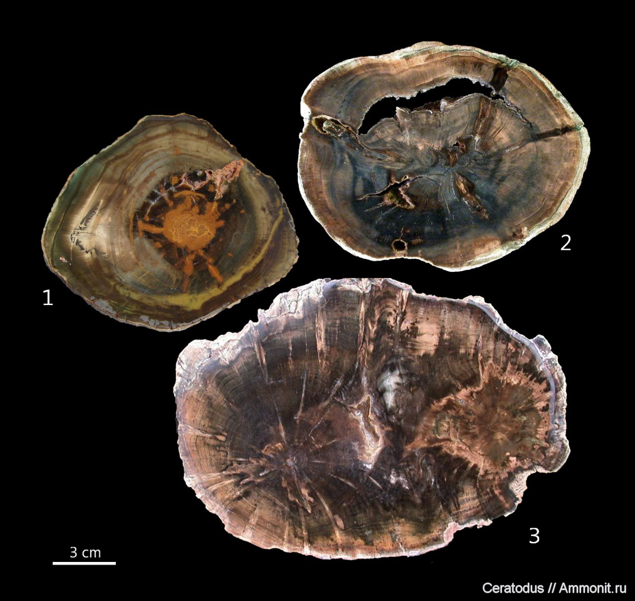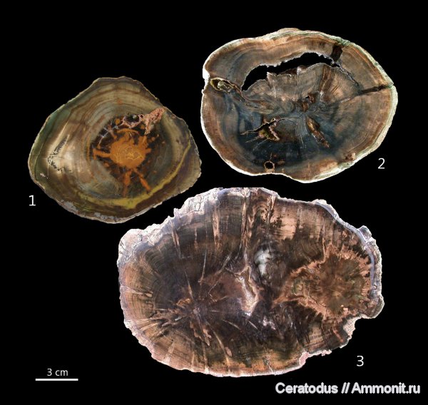 Три образца примитивного кониферофита Woodworthia из известного местонахождения окаменелой древесины Gokwe, Зимбабве. Образец под номером один имеет необычный рисунок напоминающий солнце; образец под номером 2 характеризуется наличим полости выстланной кварцевыми щетками; срез под номером три имеет две сердцевины.
