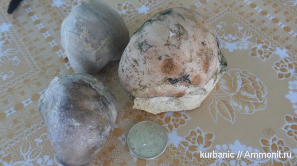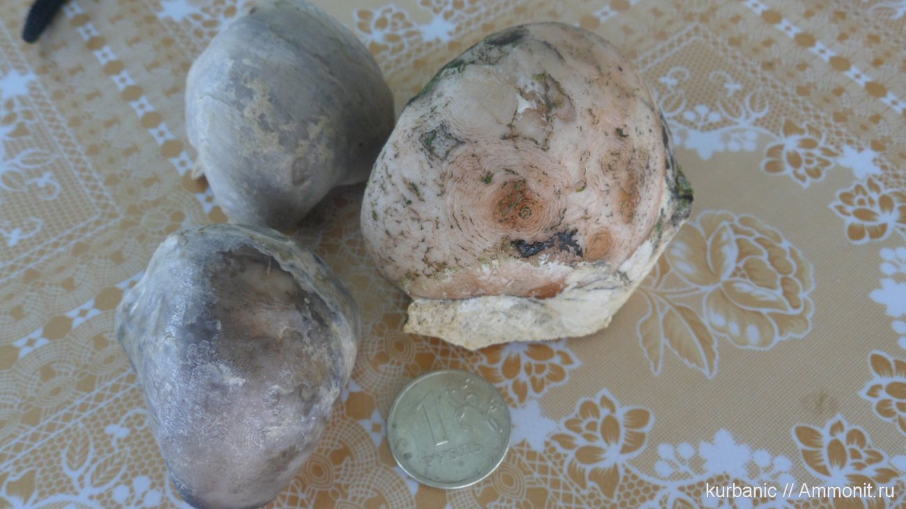 Все-таки не могу согласиться с версией о серпулах. На фото видно, что эти штуки не спиралевидные, а концентрические. Да и размеры - сколько же серпуле надо было бы сделать оборотов? У нас на брахиоподах точно минерализация, попадаются и белемниты с такими-же пятнами. | ||||||