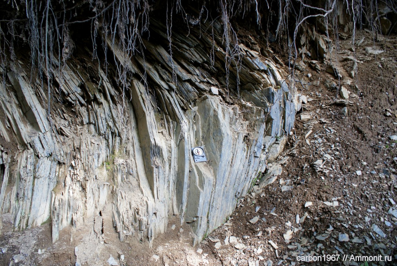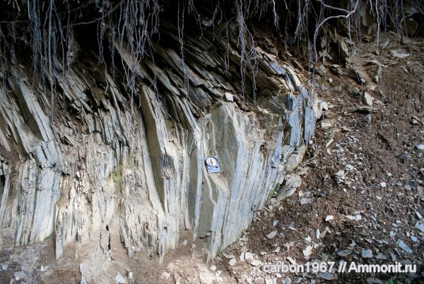 В прошлом это глинистые сланцы. Но они сохранили слоистость и расслаиваются на тончайшие пластины острые как бритва. В них встречается фауна беспозвоночных. Залегают вертикально . Ущелье реки Алибек, не далеко от п.Домбай в заповеднике.