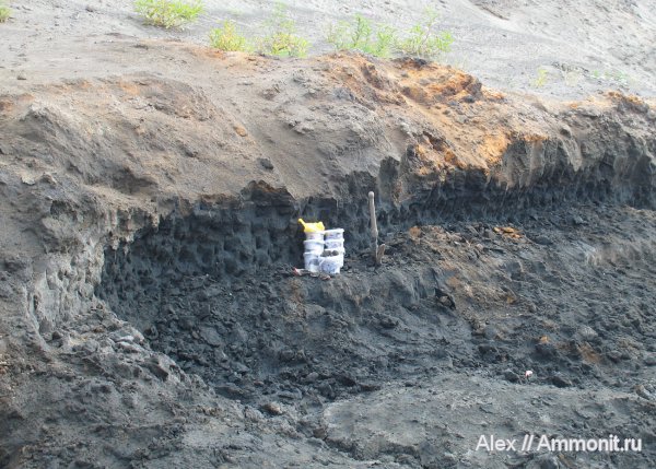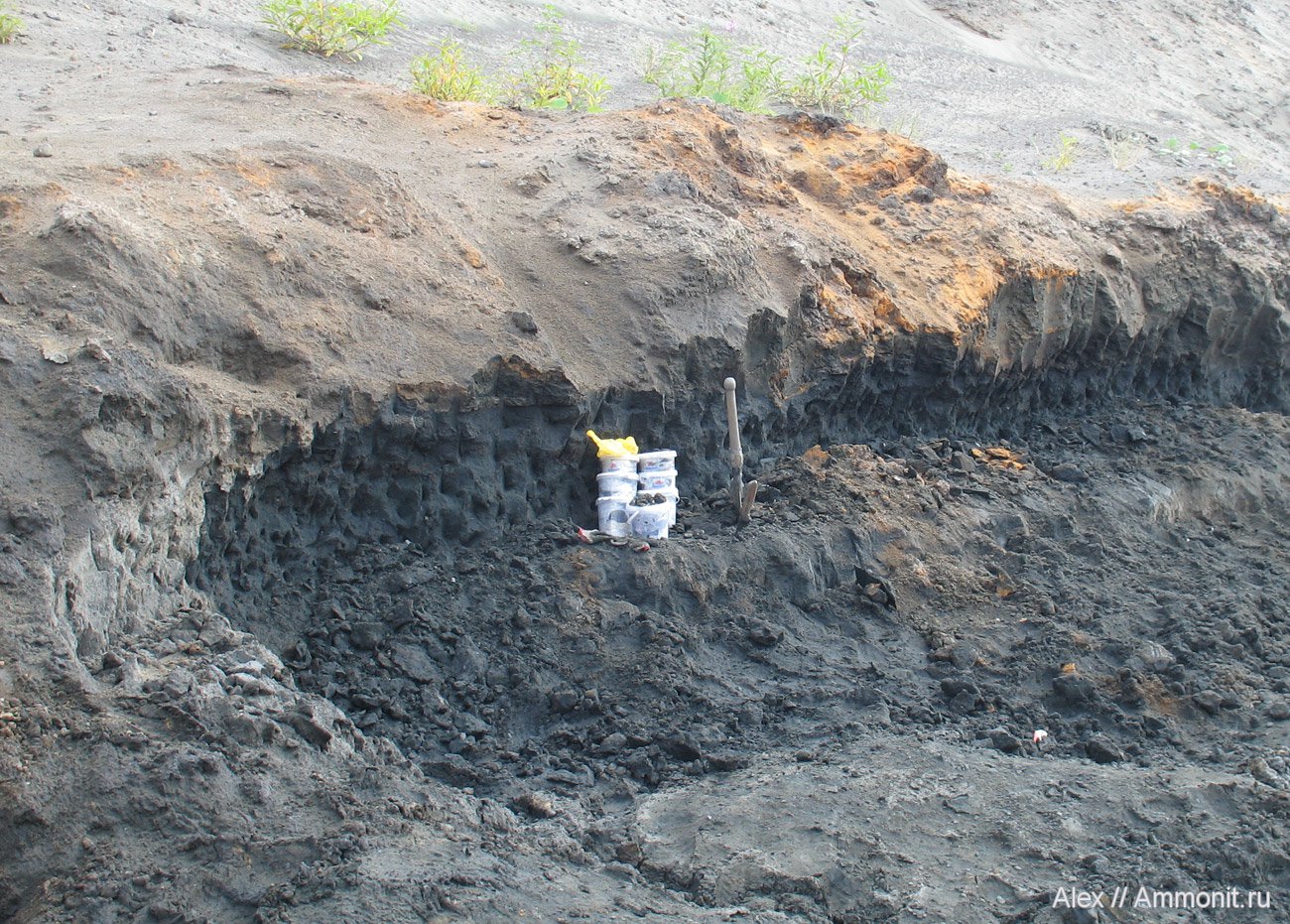 Вот так выглядит место поиска Kachpurites fulgens в Еганово. Зеленоватая стенка - собственно зона Kachpurites fulgens волжского яруса верхней юры. "Полочка" под ней, на которой стоят пластиковые емкости - зона Epivirgatites nikitini. В пластиковых коробках аммониты, но пусть объемы вас не смущают - их там на самом деле не много. Просто каждый аммонит берется с комом глины и заворачивается в пленку, так у находки больше шансов сохраниться.