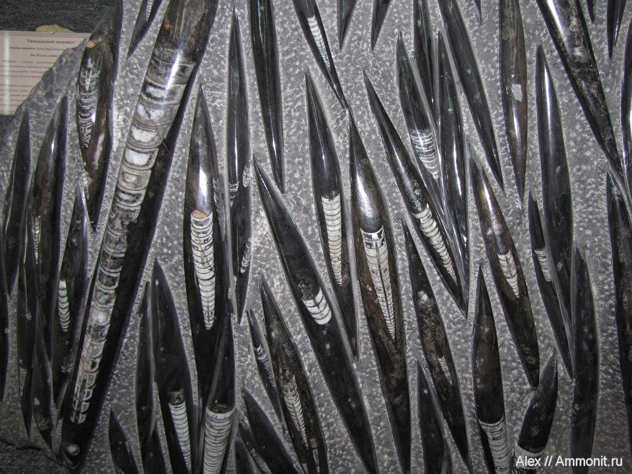 Плита с девонскими ортоцератидами Geisonoceras sp. (Geisonoceratidae, Orthocerida) из Марокко. Хорошо видно, что темные выпуклости - вовсе не раковины моллюсков, они просто вырезаны из камня, а остатки раковин разбросаны в породе довольно произвольно. Иногда на одной выпуклости видно несколько фрагмоконов, расположенных под разными углами. Так что это скорее палеоарт, чем палеонтологический экспонат.