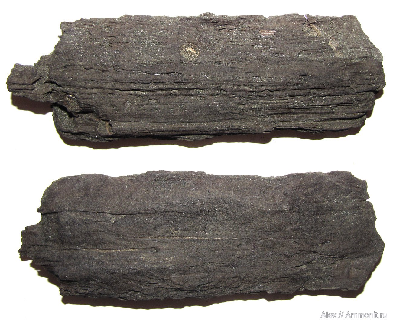 Кусок дерева из нижней части зоны fulgens в Еганово. Интересно, что вокруг всех крупных объектов - раковин макроконхов и таких деревяшек встречается много небольших раковин Kachpurites fulgens. Видимо, тогда на дне существовало не очень сильное, но все-таки ощутимое течение, сносившее мелкие раковины и собиравшее их у более крупных препятствий.