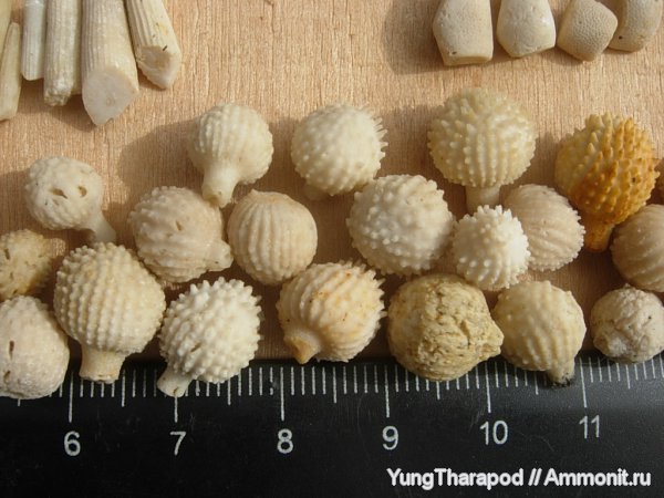 На фото вверху слева - продолговатые стержни - вероятно, тоже иглы других ежей или одиночные кораллы. Вверху справа - еще один неопределенный тип окаменелостей с пористой поверхностью.