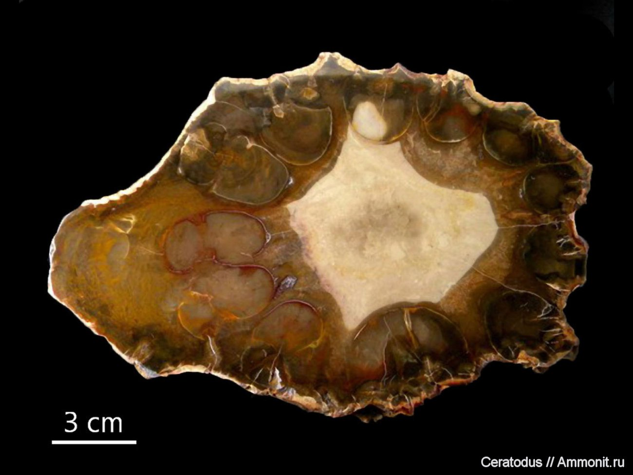 Срез ствола триасового семенного папоротника Rhexoxylon africanum из местонахождения Gokwe, Зимбабве. Кроме Южной Африки образцы Rhexoxylon'а были обнаружены в Южной Америке, Индии и Антарктиде. Необычная анатомия ствола позволила некоторым палеоботаникам предположить, что растение было лианообразным. Однако находки стволов большого (70 см) диаметра делает эту гипотезу маловероятной. Толщина образца 25 мм.