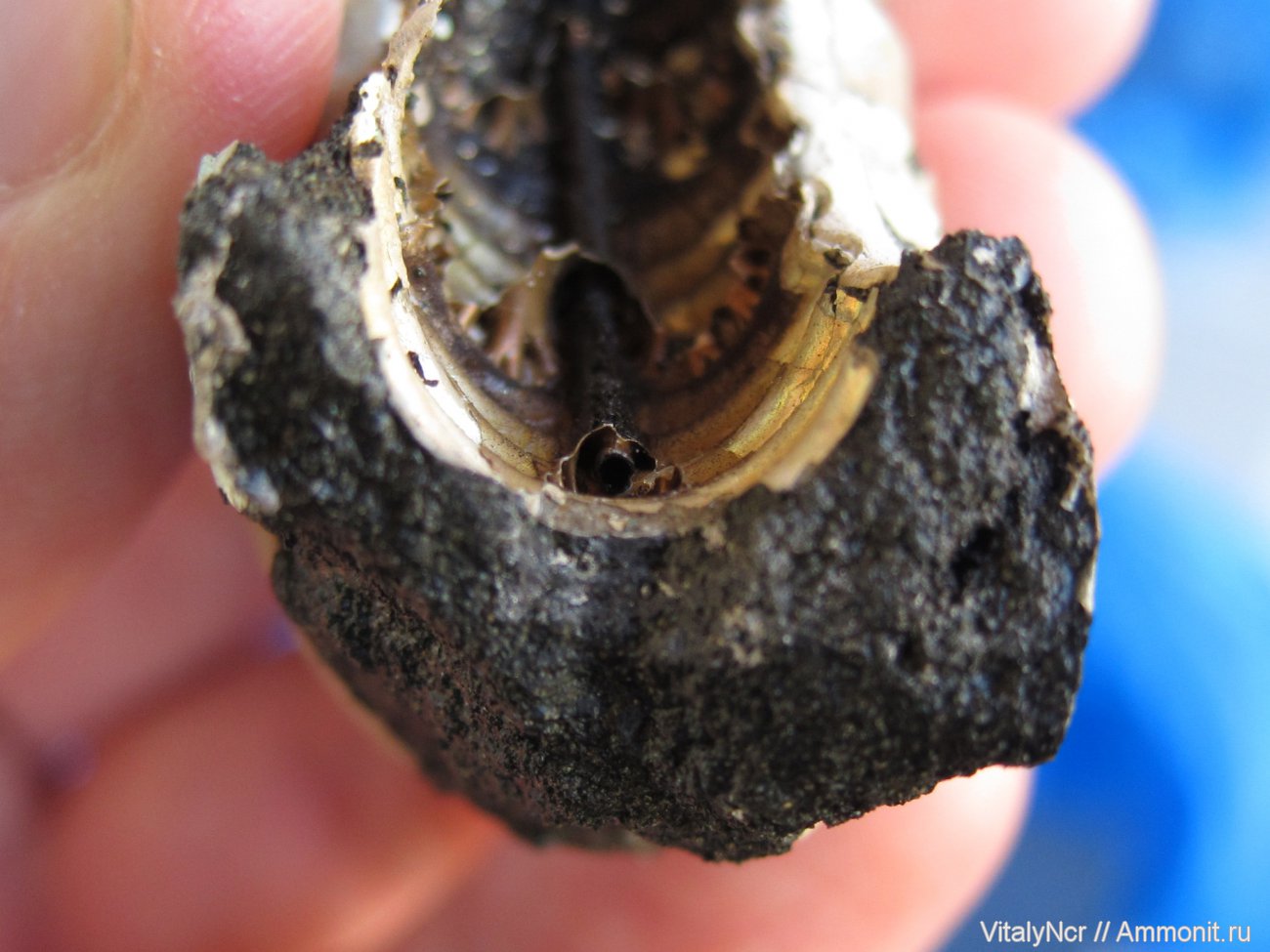 Фрагмент раковины аммонита Epivirgatites bipliciformis, виден хорошо сохранившийся сифон.