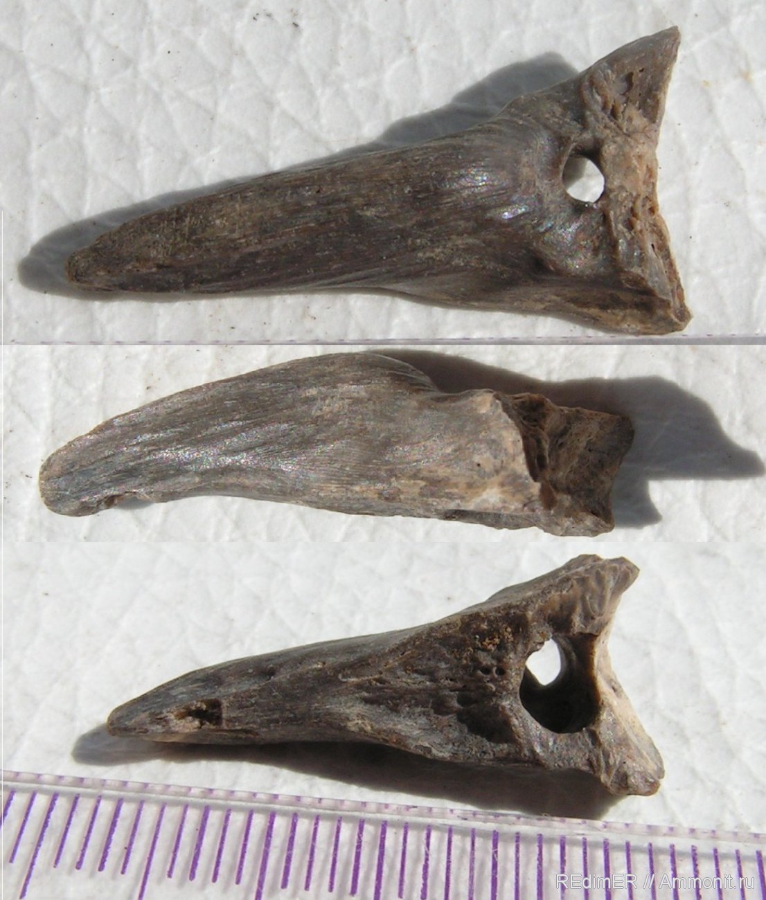 Вообщем день думал, два думал, как жить без такого дальше. И вот как раз пришла передачка из Флориды со сборами миоцен-плиоценовых зубов акул. Преимущественно всякие фрагменты зубов мегалодона и белой акулы, а также их родственников. Среди этого добра мне попалось нечто, что мне очень захотелось назвать клювом. Показал знакомым орнитологам и они, в начале не веря, признали в окаменелости родственника пеликанов Phaethon sp.