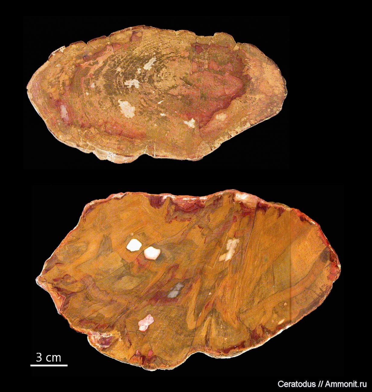 Типичные образцы древесины хвойного растения из местонахождения Chinchilla, Queensland, Австралия. Среди образцов из этого местонахождения преобладают красные, желтые и коричневые цвета. Эта древесина настолько типична, что спутать ее с образцами из других местонахождений практически невозможно.
