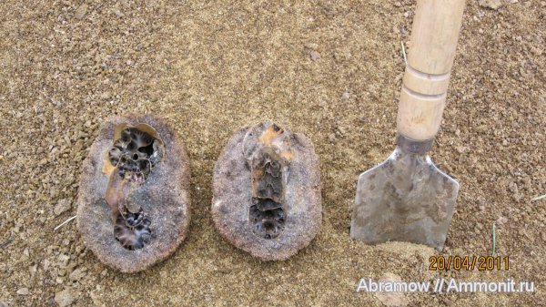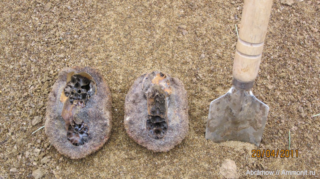 В большинстве случаев, там можно угадать как расположен внутри аммонит, и даже больше, какова его внутренняя сохранность. Правда это относится к конкрециям где то не более 40 см. в диаметре. Если ее поднять и потрясти то слышно, если внутри аммонит уже разрушен, то слышно как в этой погремушке летают туда-сюда обломки развалившихся перегородок! | ||||||