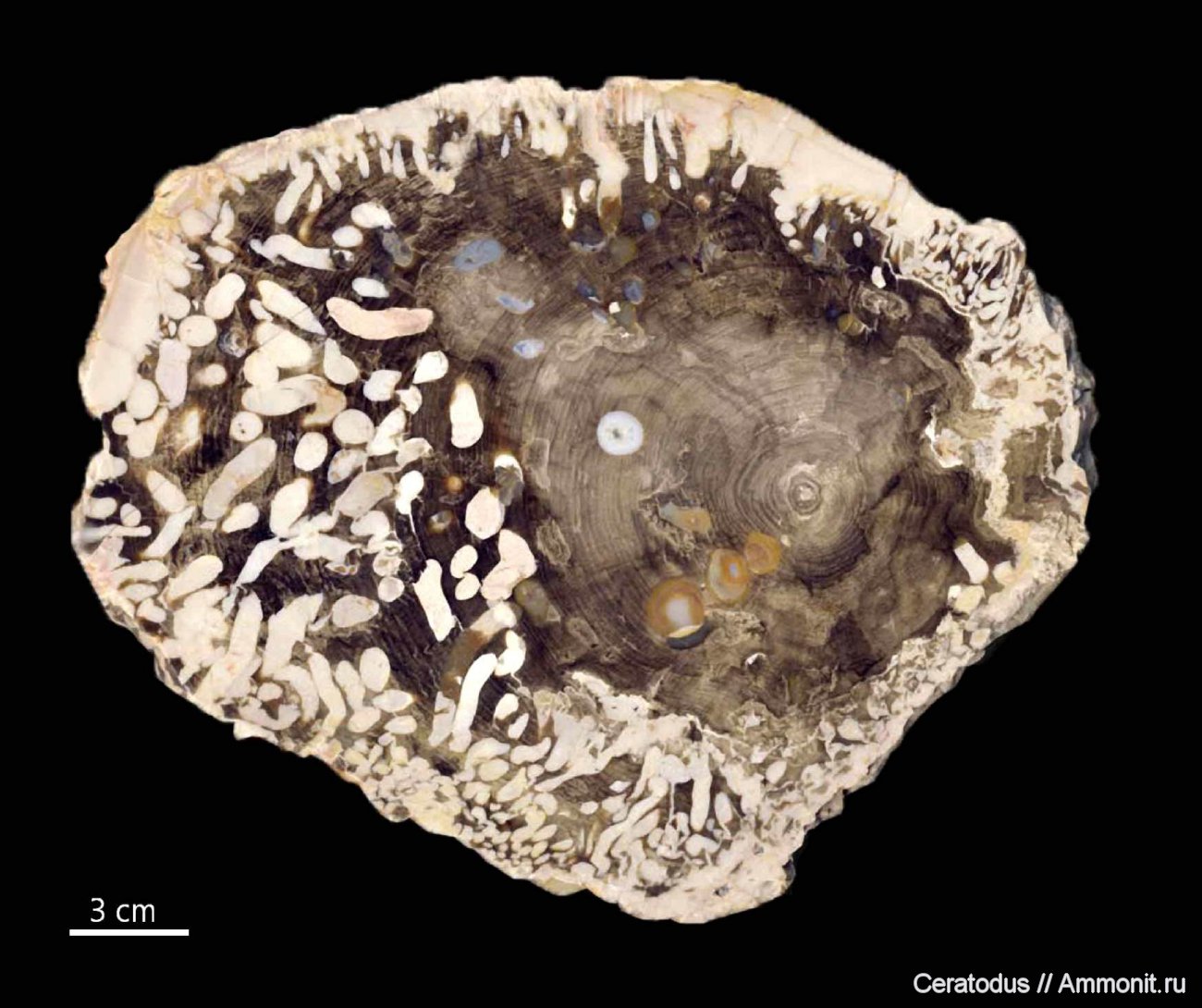 Срез дерева с ходами моллюсков-древоточцев рода Teredo. Особенностью этого образца является хорошо сохранившейся центр и края, что довольно редко для образцов этого типа. Интресно, что часть ходов заполнена агатом голубого цвета. Местонахождение Mooka Sheep Station, западная Австралия.
