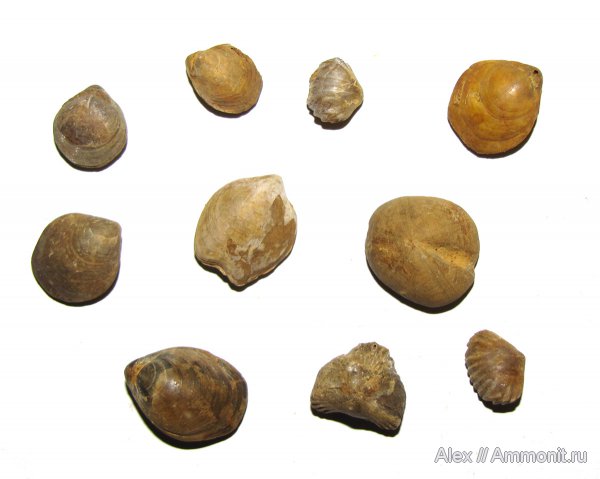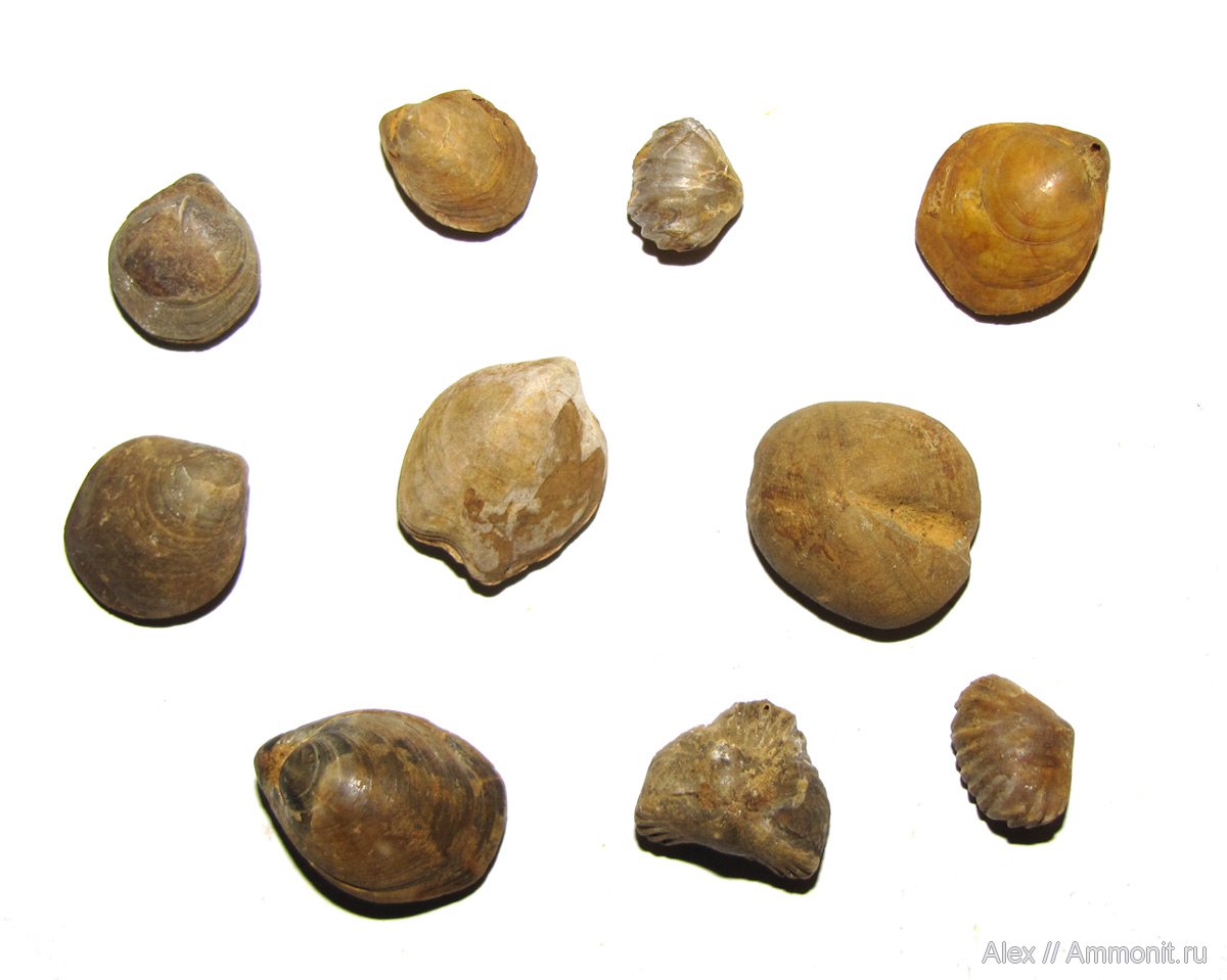 Различные брахиоподы и морской еж из келловейских мергелей в Никитино. Длина самой крупной брахиоподы и панциря ежа - 2 см.