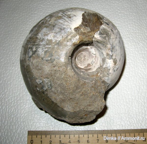 Довольно крупный экземпляр данного вида, ширина раковины около 12 см! глубина пупка 5 см! Найден в вехней части мергеля нижнего келловея на берегу р. Оки в 2007 году.