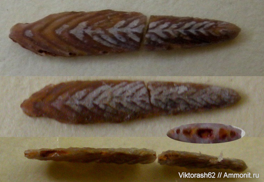 Найдена в мергелях верхнего мела в р.Днестр.Длина 8 мм. Возможно, фораминифера. Спасибо за подсказку уважаемому IEVB-museum. По книге это 100% фораминифера - Frondicularia crimica Schknina.