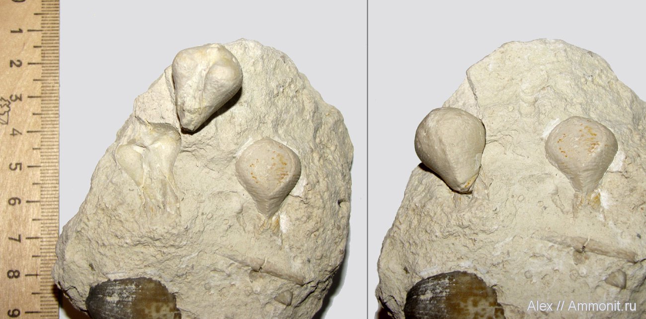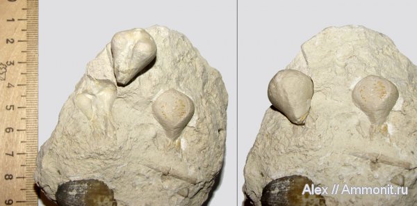 Одно ядро раковины выпало из камня - на левой фотографии оно лежит отдельно, на правой - посажено на исходное место. Другой образец я оставил в камне, в том виде, в каком он был найден. Раковины довольно крупные - 2,5 см в длину с учетом ловчего аппарата. Снизу в камне фрагмент брахиоподы Choristites.