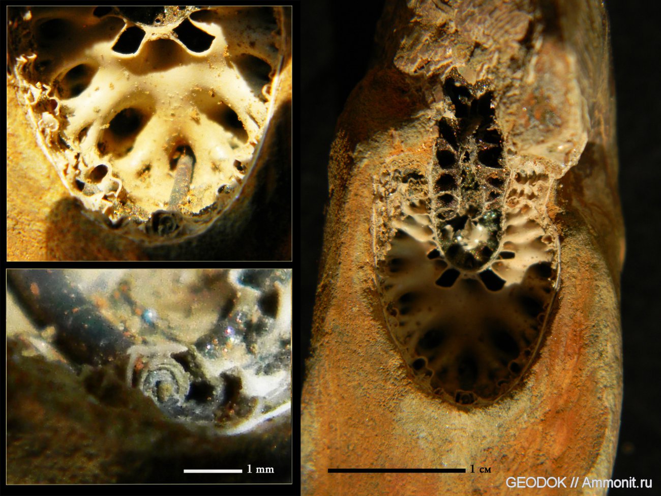 Уникальная сохранность начальных оборотов Еuрhyllосеrаs velledae дает нам возможность увидеть внутреннее строение раковины аммонита. На фото хорошо виден сифон, имеющий более темную окраску, в отличие от перегородок.