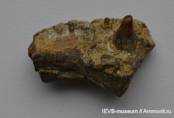 Фрагмент симфиза челюсти. Видны зубной ряд (по верхнему краю) и отдельный клык. Длина фрагмента ок. 4 см.
