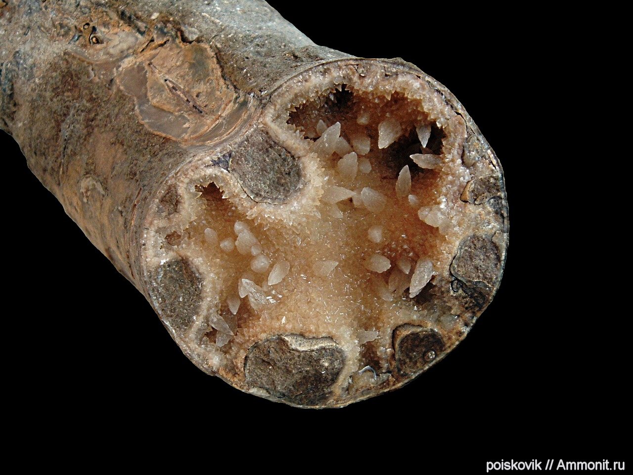 Фрагмент фрагмакона аммонита. Ширина фрагмента - 4,5см. Стенки камеры покрыты кристаллами кальцита длиной до 7мм. Сам аммонит, судя по сохранившимся частям, около 30см. в диаметре.
