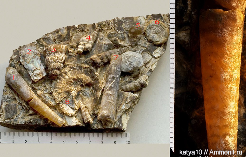Гастропода 4 и гастропода под аммонитом 8 - наверное Turitella | ||||||