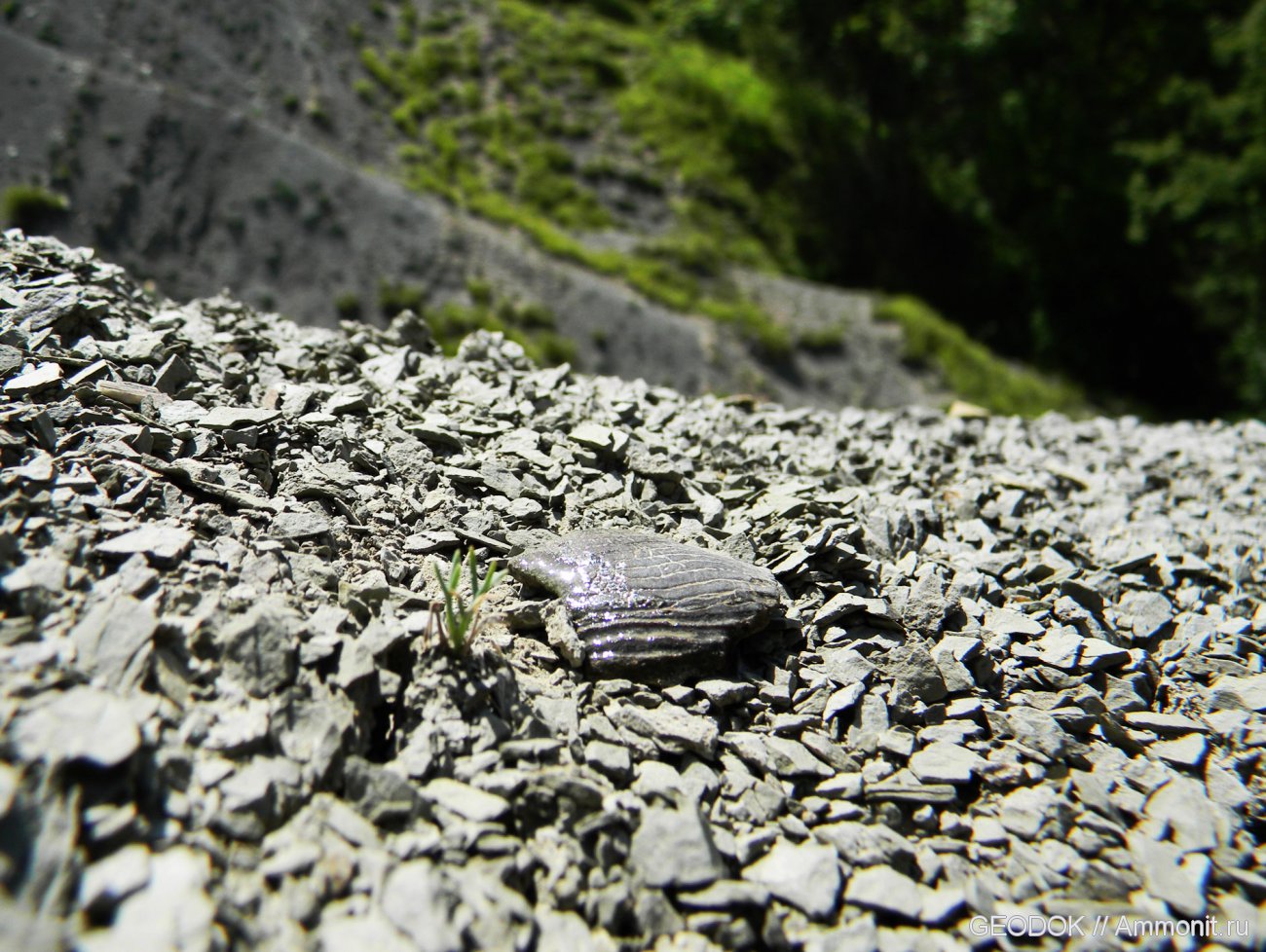 В обнажении плотных известковистых глин местонахождения присутствует палеофауна титона. На фото виден фрагмент Punctaptychus punctatus. Помимо аптихов здесь найдены: