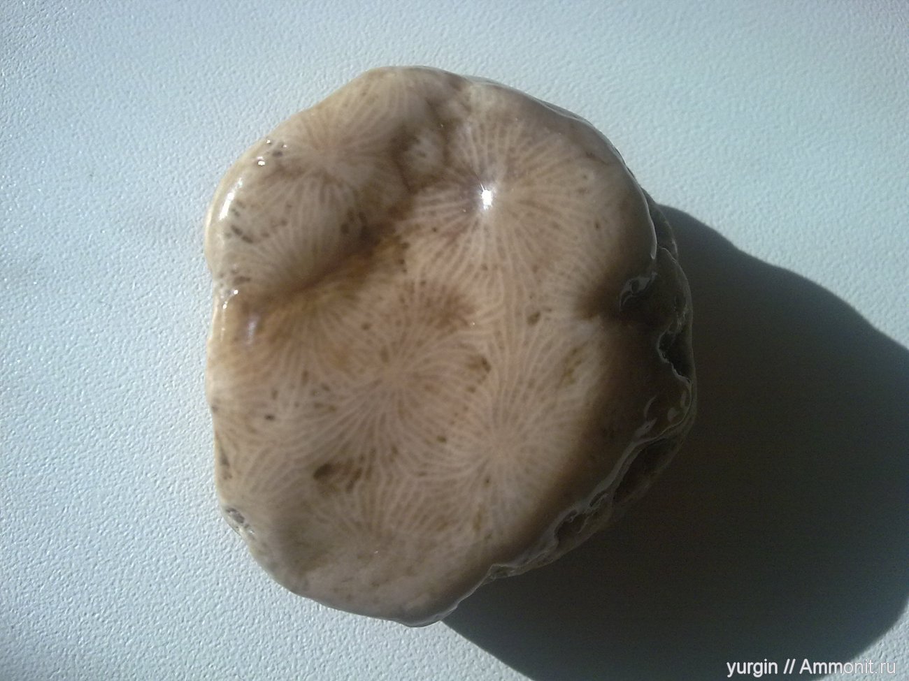 Диаметр около 4 см, высота 2 см. Поверхность покрыта лаком для подчёркивания структуры.