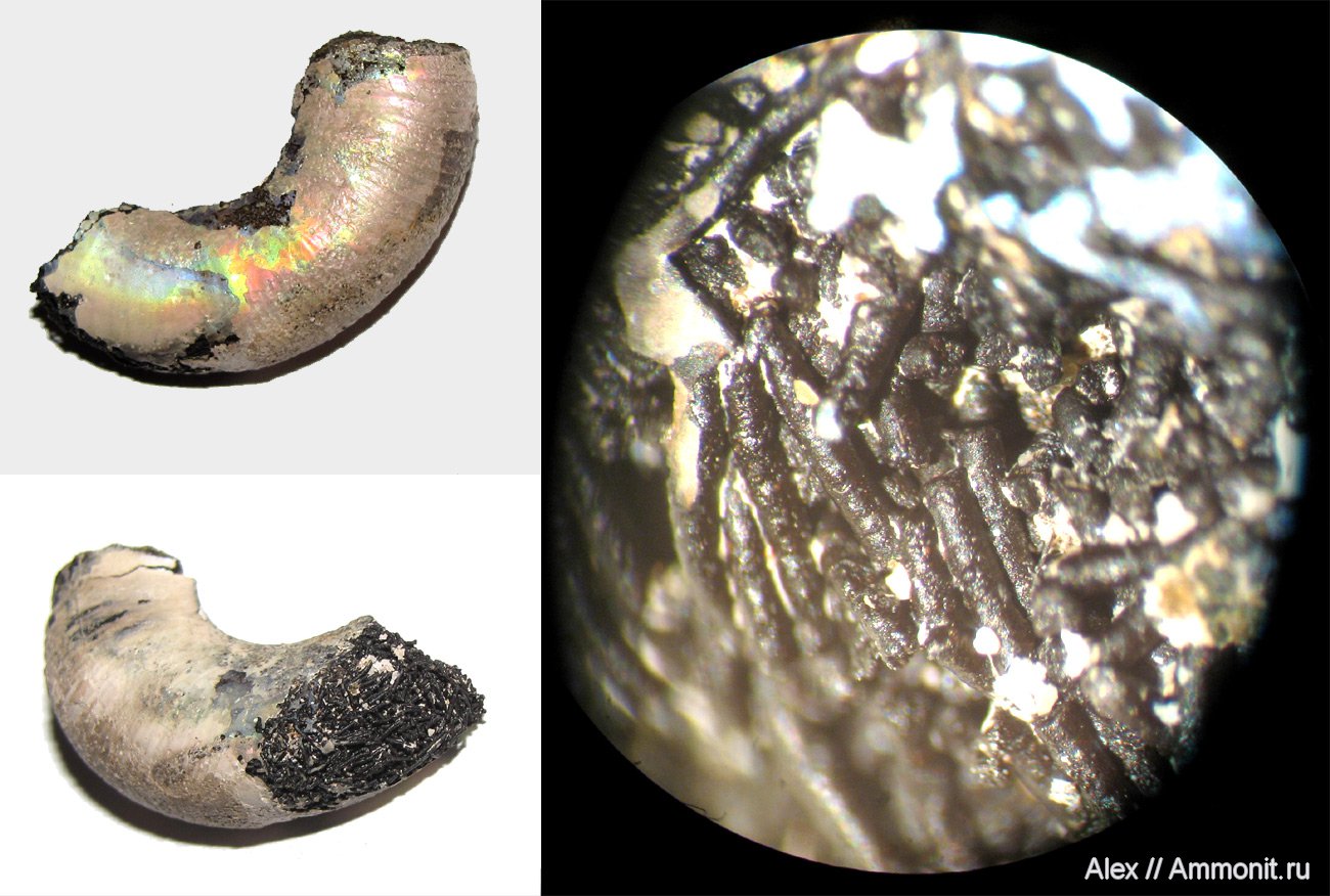 Иногда во время поисков отпечатков мускулов на жилых камерах Kachpurites (на фото слева вверху) внутри жилых камер попадаются различные мелочи. Иногда это маленькие аммониты (например Спрятавшийся аммонитик), а иногда - скопления мелких тонких палочек, которые видны на фото слева внизу и справа (под микроскопом). Думаю, что это спикулы губок. Попадаются такие находки довольно редко, пока я обнаружил их всего лишь в двух жилых камера кашпуритов. Длина всего фрагмента аммонита - 3 см, отдельных спикул - порядка миллиметра.