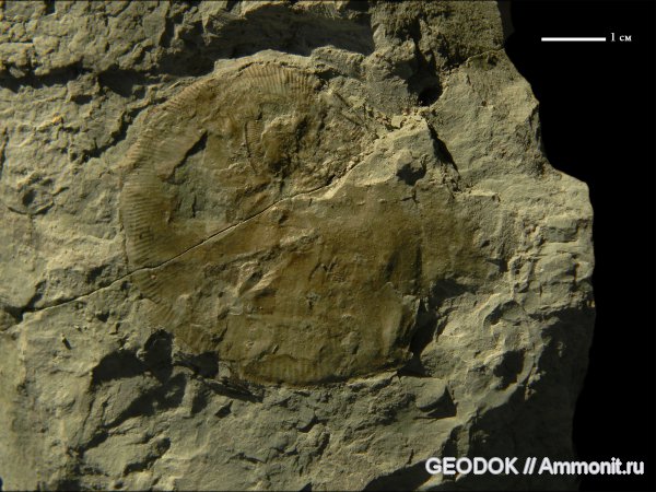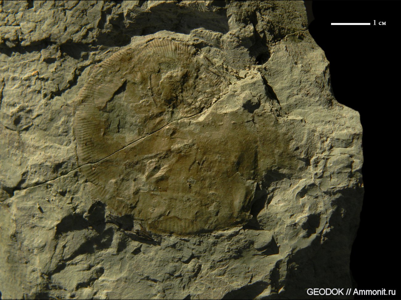 Образец из берриаса Горячего Ключа. Сохранность не очень, видна тонкоребристая скульптура на околовентральной стороне боков, и очевидно переходящая на вентор. Пупок очень узкий, обороты высокие, сильно инволютные.