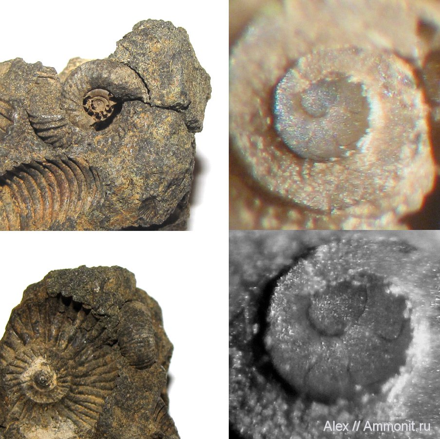 Аммонит виден на фото слева, аммонителла - справа. Один из снимков для контрастности я сделал черно-белым. Аммонителла сфотографирована с помощью микроскопа МБС-1.