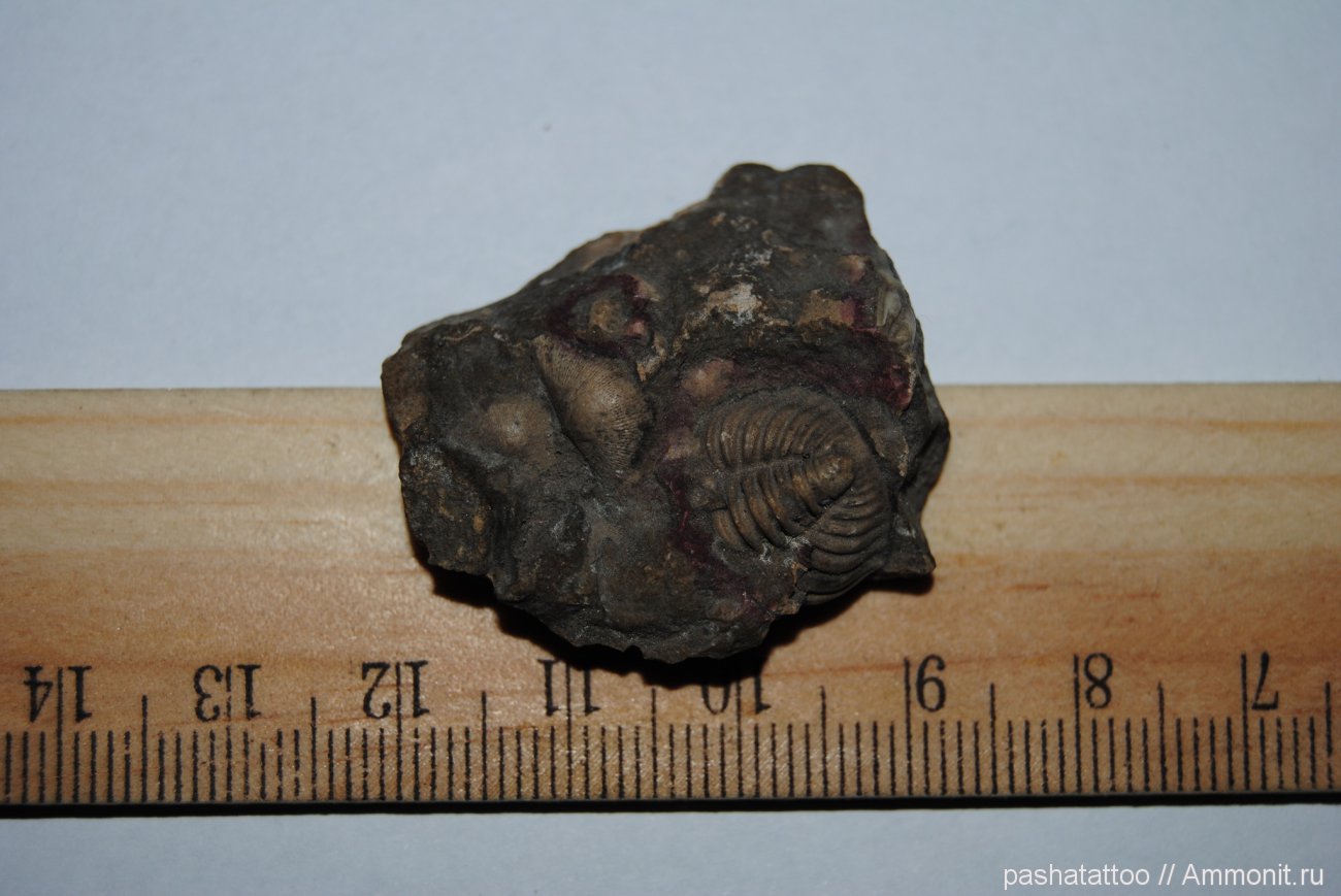 а откуда этот образец? я бы предположил, что это кукерский (кукрузеский) горизонт и ядро пигидия Chasmops odini Eichwald и брахиоподы Sowerbyella sp. | ||||||