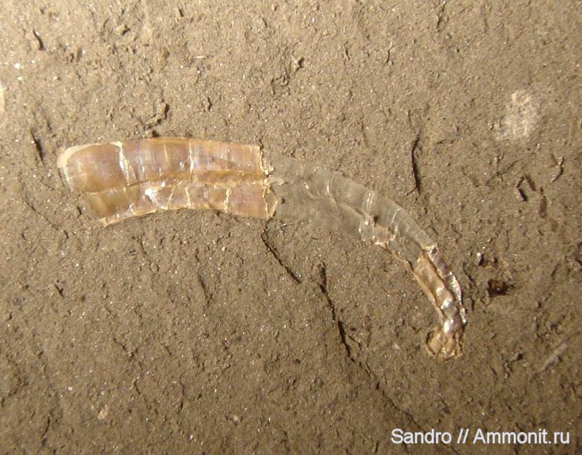 Раковина гетероморфного аммонита на глине. молодая особь.