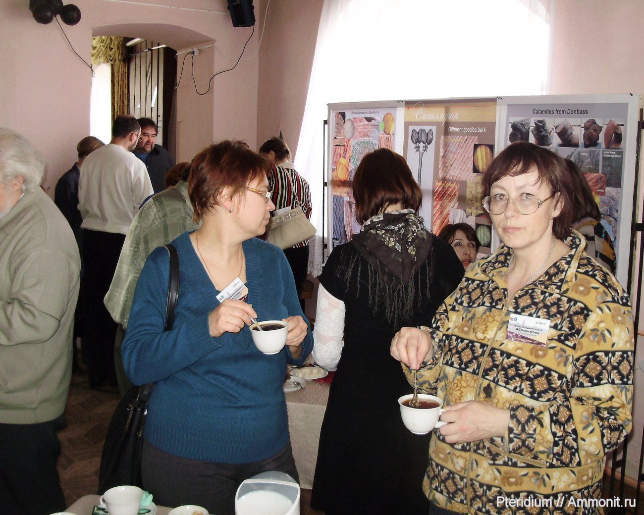Палеонтологи обсуждают впечатления от докладов за чашечкой кофе.