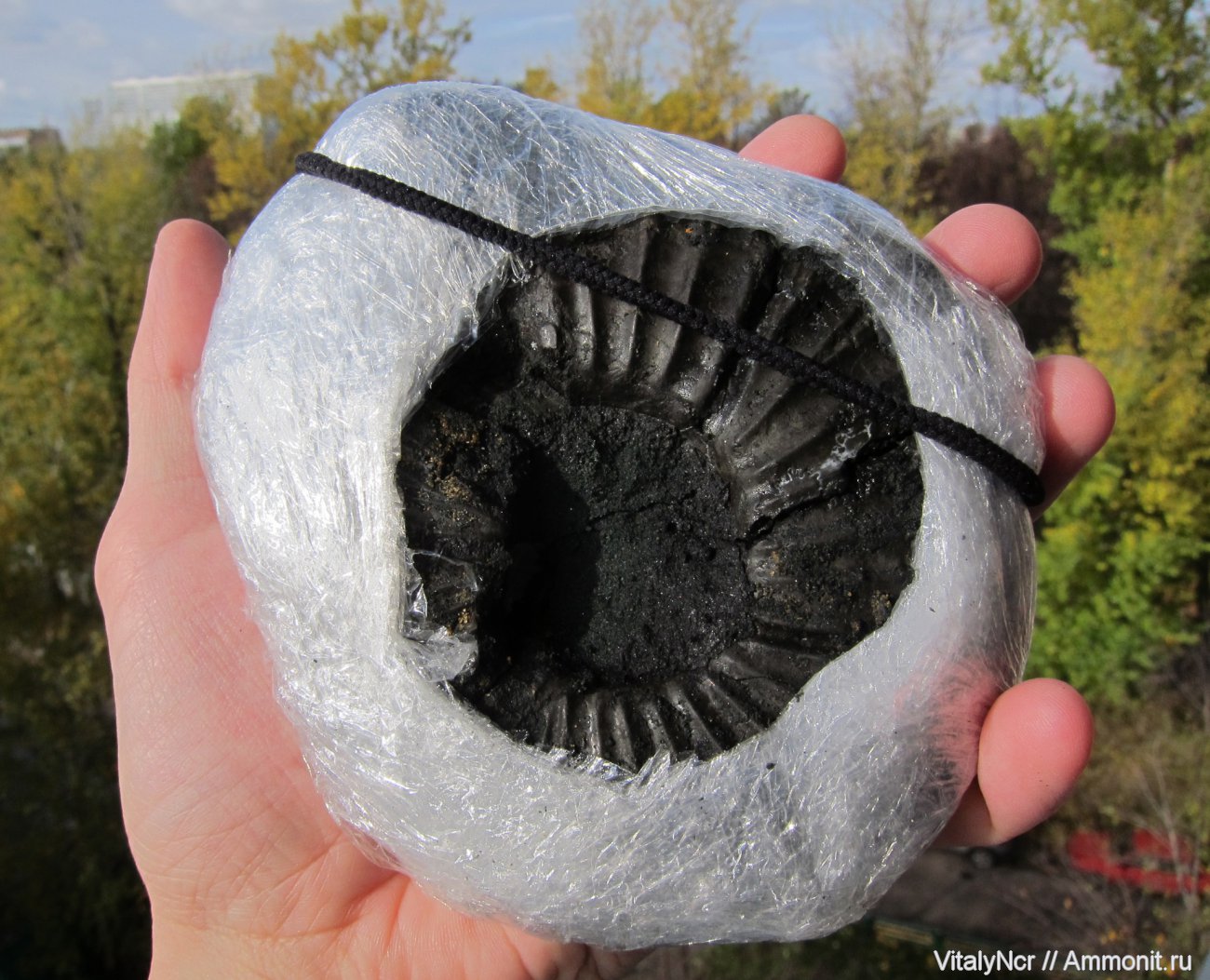 Аммонит Virgatites sp. в процессе обработки. Вот так подчас приходится их проклеивать, прямо в транспортировочной плёнке, лишь частично её срезав.