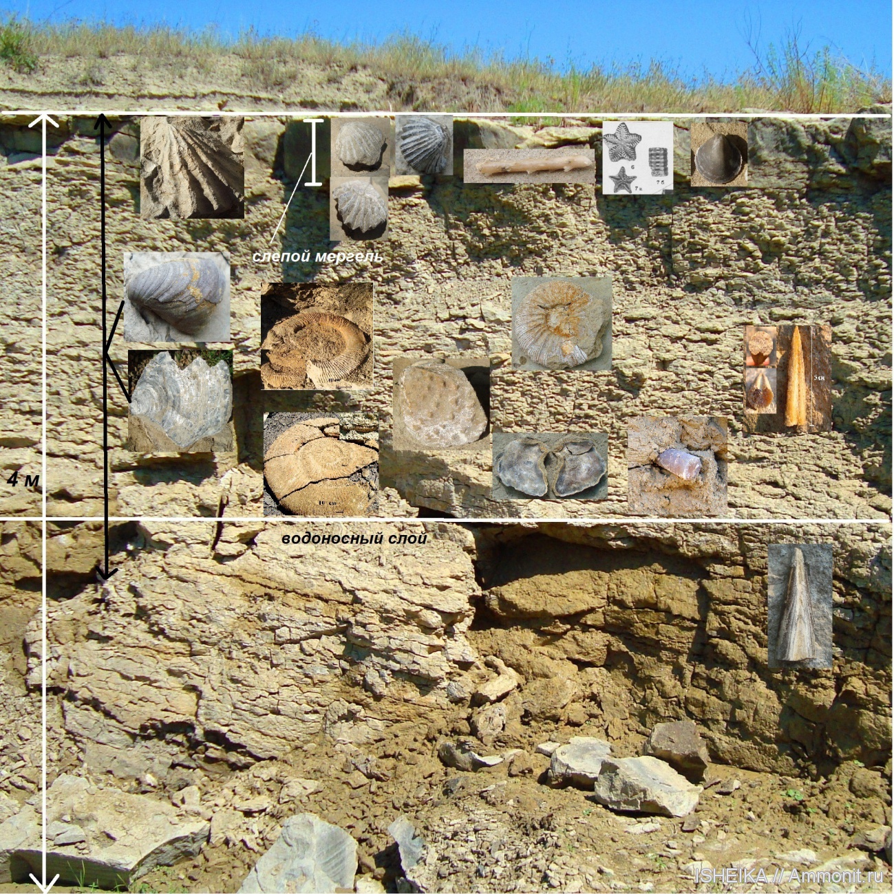 Под слоем почвы залегает слой мергеля толщиной до 40 см, без фоссильного материала. В верхнем слое мергеля встречаются, в основном, замковые брахиоподы, отпечатки двустворок, аммонитов, кринодеи, очень редко обломки игл морских ежей плохой сохранности.