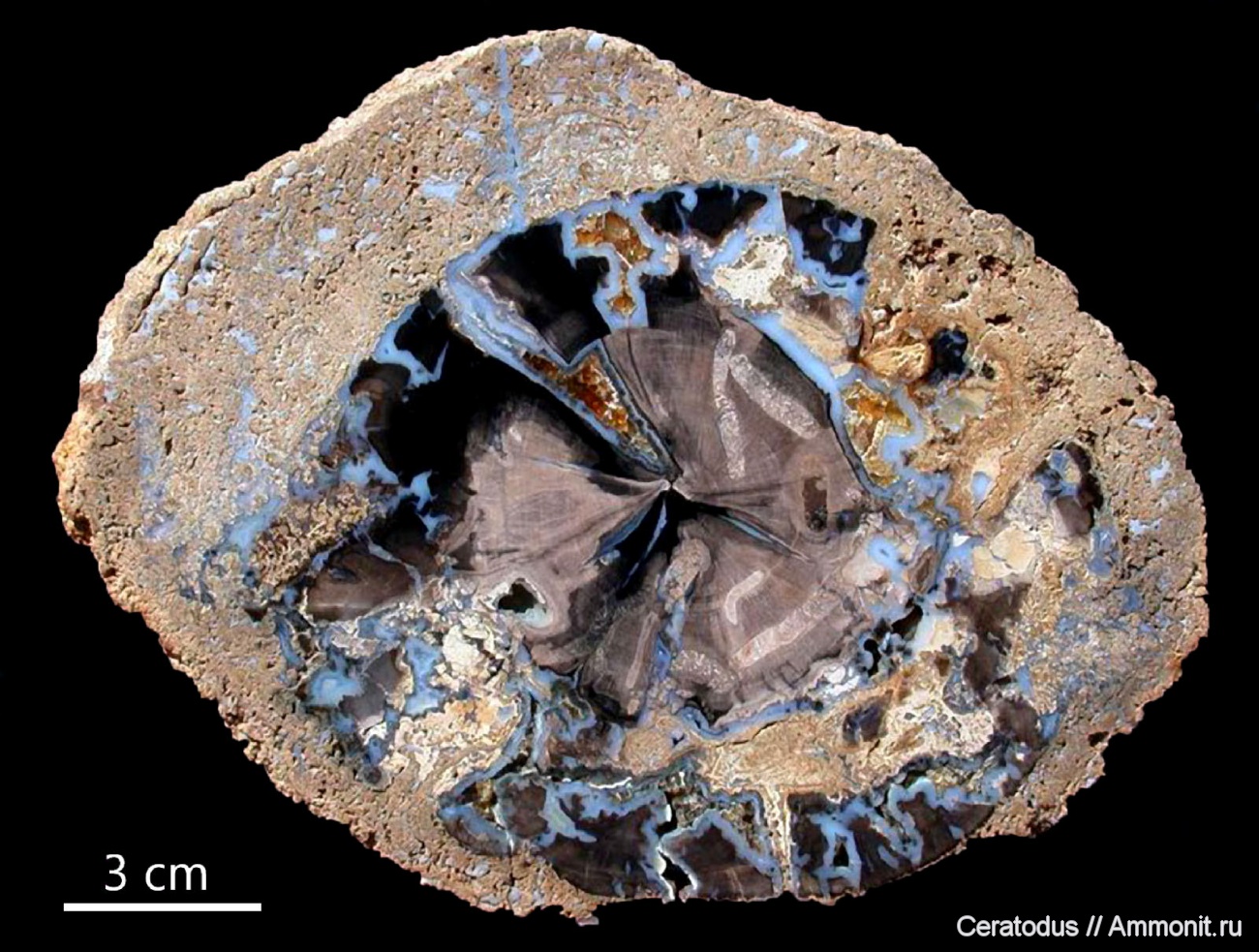 Дерево из Eden Valley с включениями агата и кальцитом. Хорошо заметны ходы насекомых древоточцев (в центре) и муфта из водорослей вокруг остатков ствола.