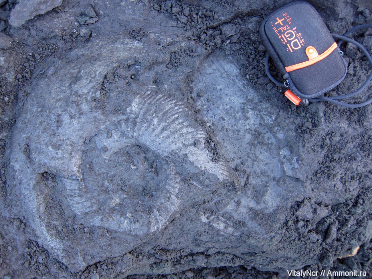 Отпечаток крупного аммонита Virgatites larisae (?) в толще глин подзоны Cr.ivanovi.