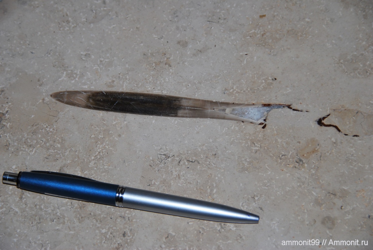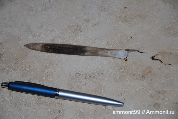 Очень интересный белемнит. По этому фото можно даже изучать строение белемнита - ростр, фрагмокон в нем и вроде даже остаток проостракума на правой оконечности образца. | ||||||