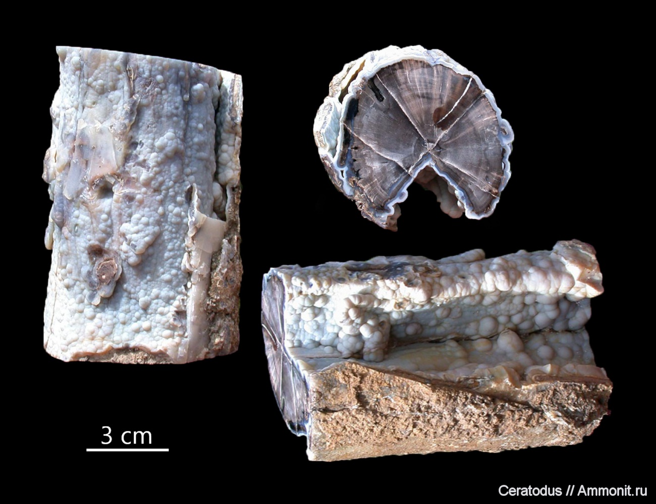 Еще один образец поверхность которого образована натечной формой халцедона. Следует отметить, что, как правило, халцедоном выстланы полости между стволом и водорослевой рубашкой, которая затем удаляется в процессе препарирования. В итоге халцедон остается только на поверхности, прилегающей к стволу.