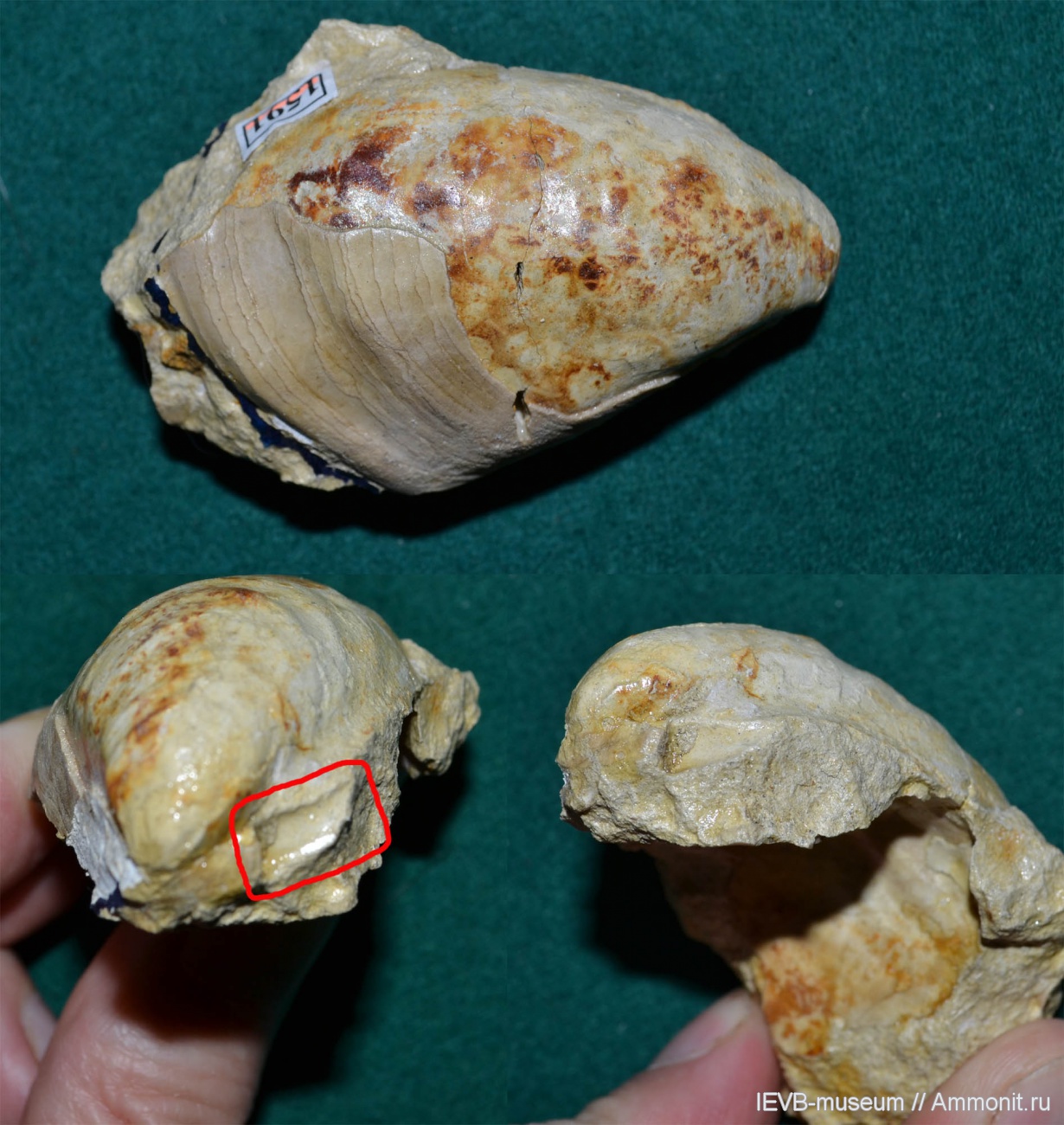 Ядро ювенильной особи с частично сохранившейся раковиной. Место выпавшего участка замочного края обведено.