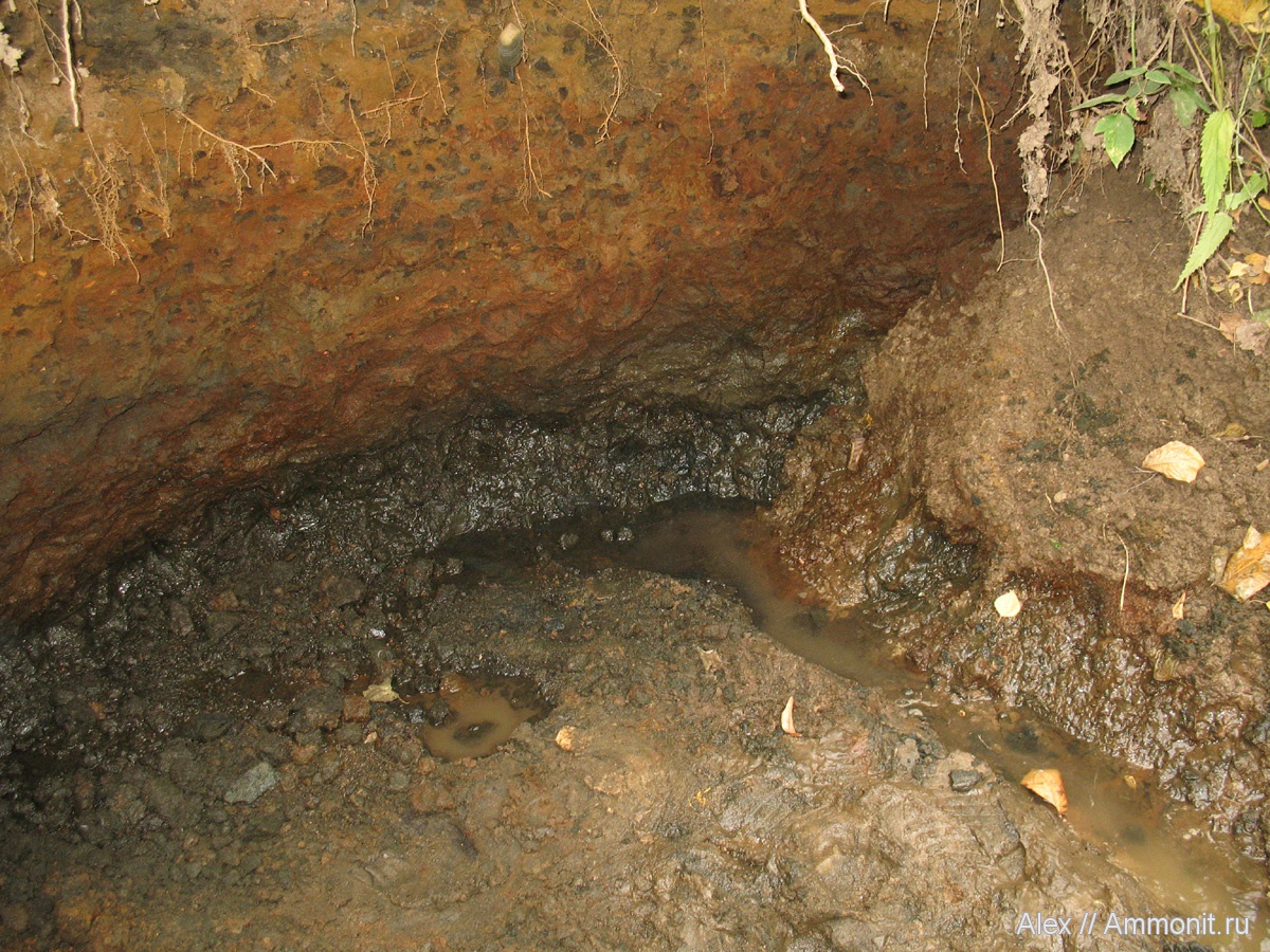 Вот так выглядит контакт зон fulgens и subditus в Филевском парке осенью. Вода сочится прямо из слоя черной песчанистой глины с аммонитами Kachpurites subfulgens, которым такая увлажненность явно не идет на пользу. Выше, в рыжеватой породе, кашпуритов уже нет, зато появляются Garniericeras, правда очень плохой сохранности.