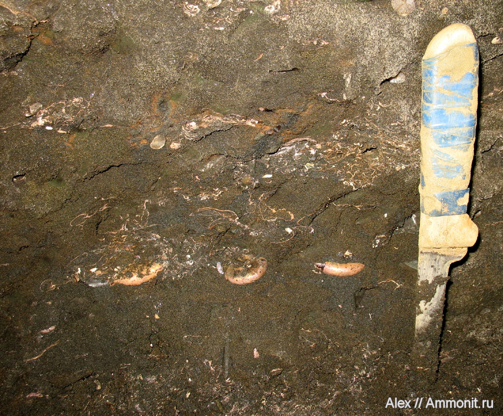 этот слой и есть каша из прессованных раковин аммонитов, ниже брахиопод, где кое где и попадаются целые раковины. Лично для меня поиски аммонитов в Мневниках одни мучения и разочарования, последний раз ездили когда, вообще даже на них не отвлекался, помогали мне совместынми усилиями брахиоподы собирать, а потом же надо еще по технологии клеить эти аммониты Красота своими руками , но в Еганово на мой взгляд они прочнее. Тут дело в том, что их можно найти вот так ими полюбоваться, а расчистить и вытащить из земли не получиться. Обычная находка Обломок макроконха Kachpurites fulgens, а эта Ребристый Kachpurites fulgens вообще вызывает массу вопросов по поиску, извлечению и доставке до дома и последующей проклейке... | ||||||