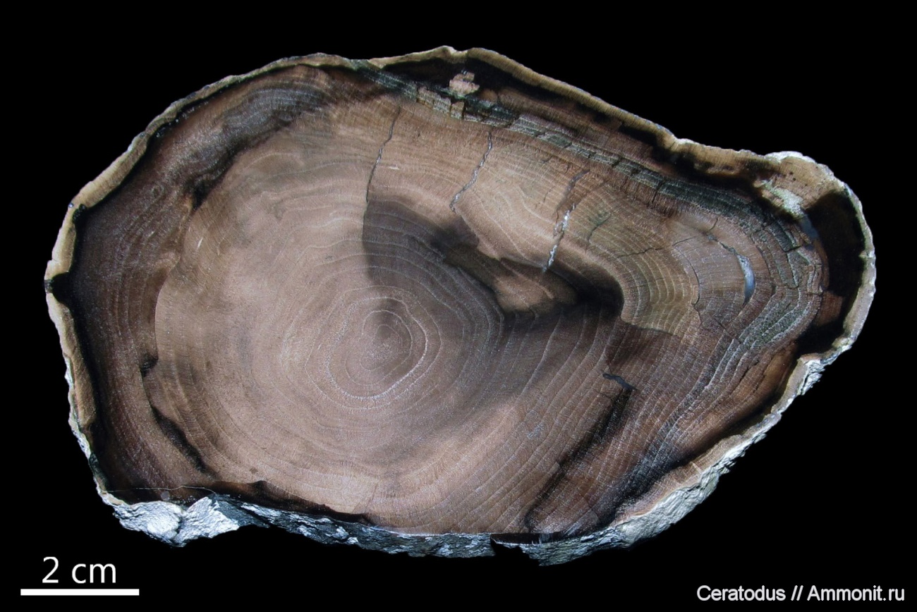 Срез ствола вишневого дерева с хорошо сохранившимися годичными кольцами. Местонахождение McDermitt, формация Trout Creek, штат Орегон.